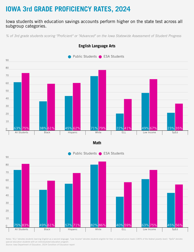 In every reported demographic category (I’ve chosen my seven favorites for space), ESA students perform better than students in public schools.