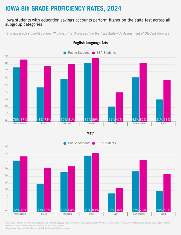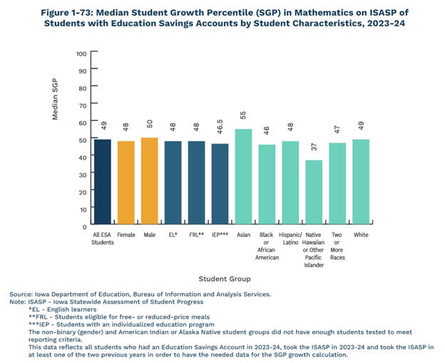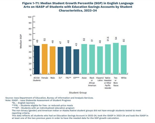 To place Iowa in a national context, the state requires all private schools receiving ESA funds to be accredited, and to be accredited, a school must administer the state test. As such, ESA schools were used to working with the ISASP before the program began. No growing pains required there.